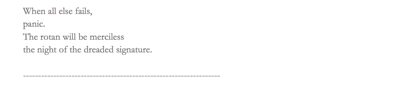 “A poem’s completion is an arbitrary thing, and yet it isn’t. Imagine an awkward ballroom dance. Image over. Will you remember it? Probably not, and so poems can also be fleeting. Completions are slightly overrated. The opening ceremony of a building involves cutting some ribbons, and yet the building is not static. It is a place, a home, open to ruin. There’s demolition art. Poems and buildings have some similarities. There are infinity pools and moldy basements, and if the door closes and no one hears it, is it A Clockwork Orange? To work towards completion, in a way, is like the ending of a silent gong. Except the sound doesn’t end there.”