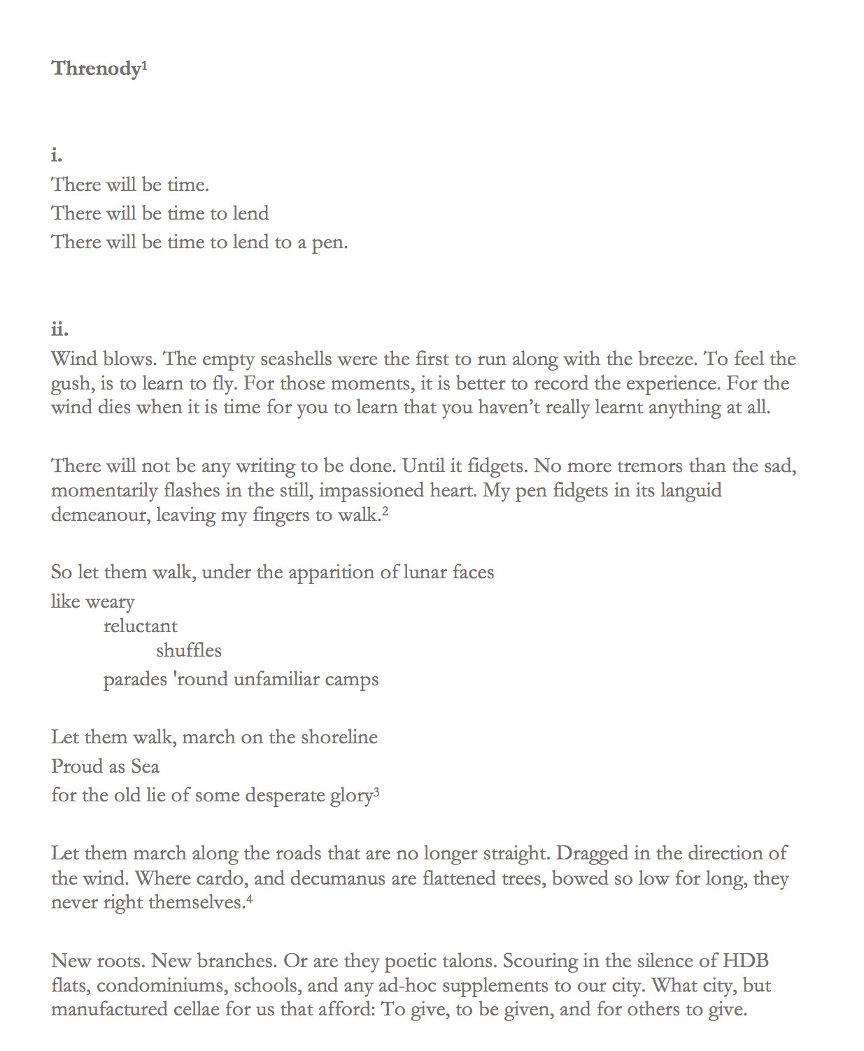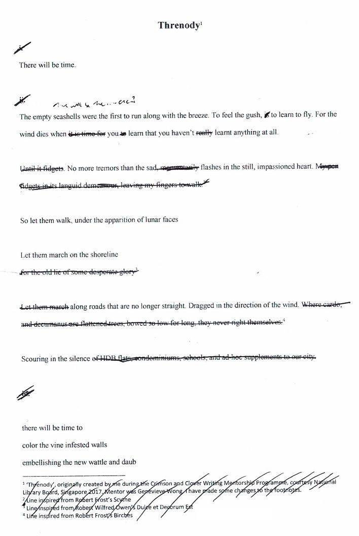 “After months of procrastination, I started on this with an editor’s mindset, taking a pen to it and striking out lines that seemed to me to be not pulling their weight, in the process cutting the poem down from its original four pages to two, and then from two to one. I then had a decision to make, which was whether to keep to my original plan of exploding the footnotes. Eventually, I elected to rewrite the one-pager, and to maintain generative momentum I of course had to have a formal constraint, which I decided should be physical lengths in monospace fonts, not least because that would enforce rework and rearrangement of the surviving lines.”