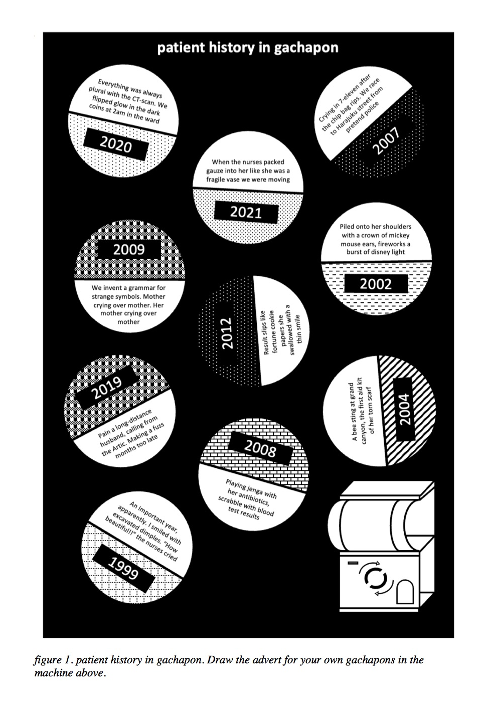 Gachapon (ガチャポン) are a variety of vending machine-dispensed capsule toys that originated in the 1960s and became popular in Japan and elsewhere. Many sat quietly in Singapore's heartlands for decades, particularly in the 1990s-2000s. They are, by nature, a "blind purchase": one slots in a coin, cranks the machine, and hopes to get the toy or figure they desire. When doctors take a patient's history, stories can spring up in a similarly random fashion. As not all the information is medically critical, doctors can elide the details that make a patient a person. This is especially true in Singapore's context, as doctors often only have a limited amount of time to see each patient. patient history in gachapon alludes to the importance of recognising a patient's humanity, by placing importance on all parts of their history.