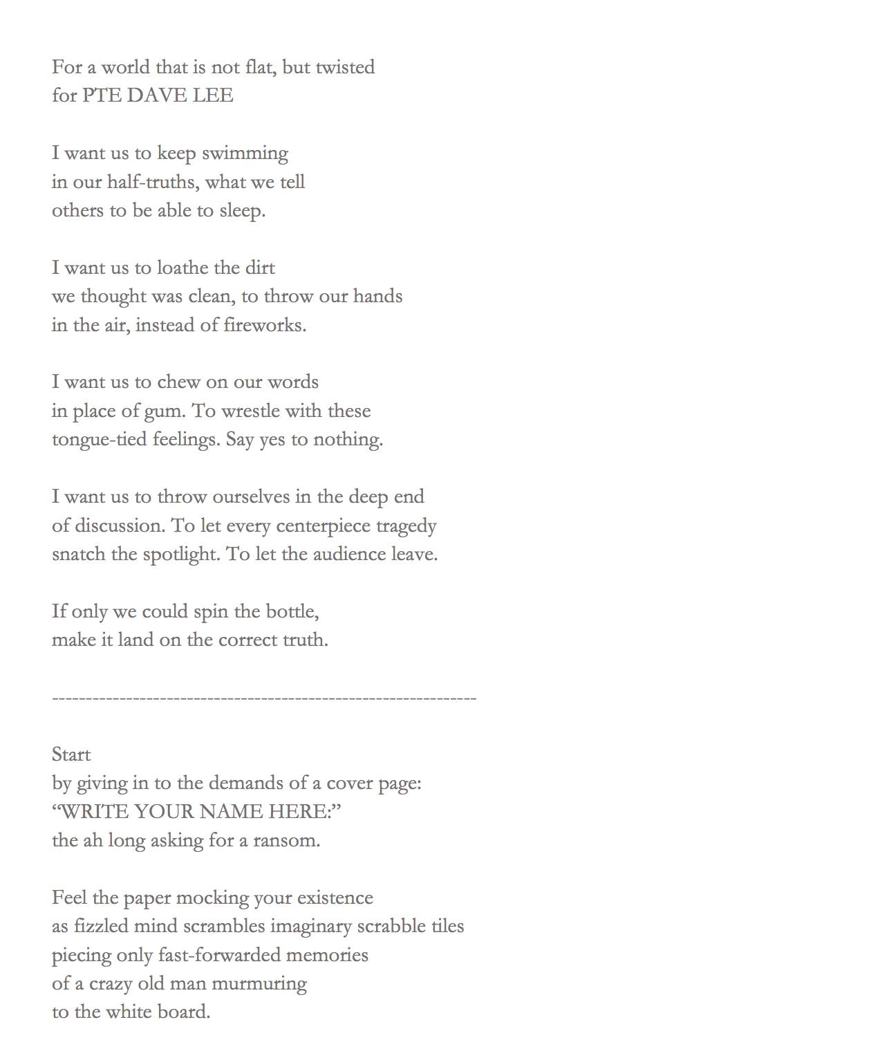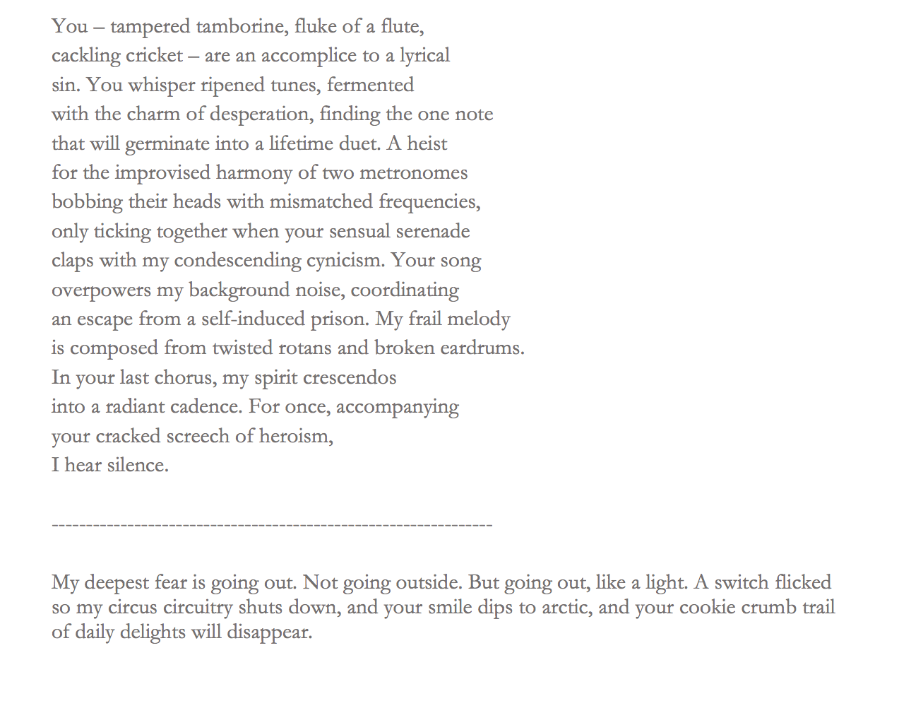 “A poem’s completion is an arbitrary thing, and yet it isn’t. Imagine an awkward ballroom dance. Image over. Will you remember it? Probably not, and so poems can also be fleeting. Completions are slightly overrated. The opening ceremony of a building involves cutting some ribbons, and yet the building is not static. It is a place, a home, open to ruin. There’s demolition art. Poems and buildings have some similarities. There are infinity pools and moldy basements, and if the door closes and no one hears it, is it A Clockwork Orange? To work towards completion, in a way, is like the ending of a silent gong. Except the sound doesn’t end there.”