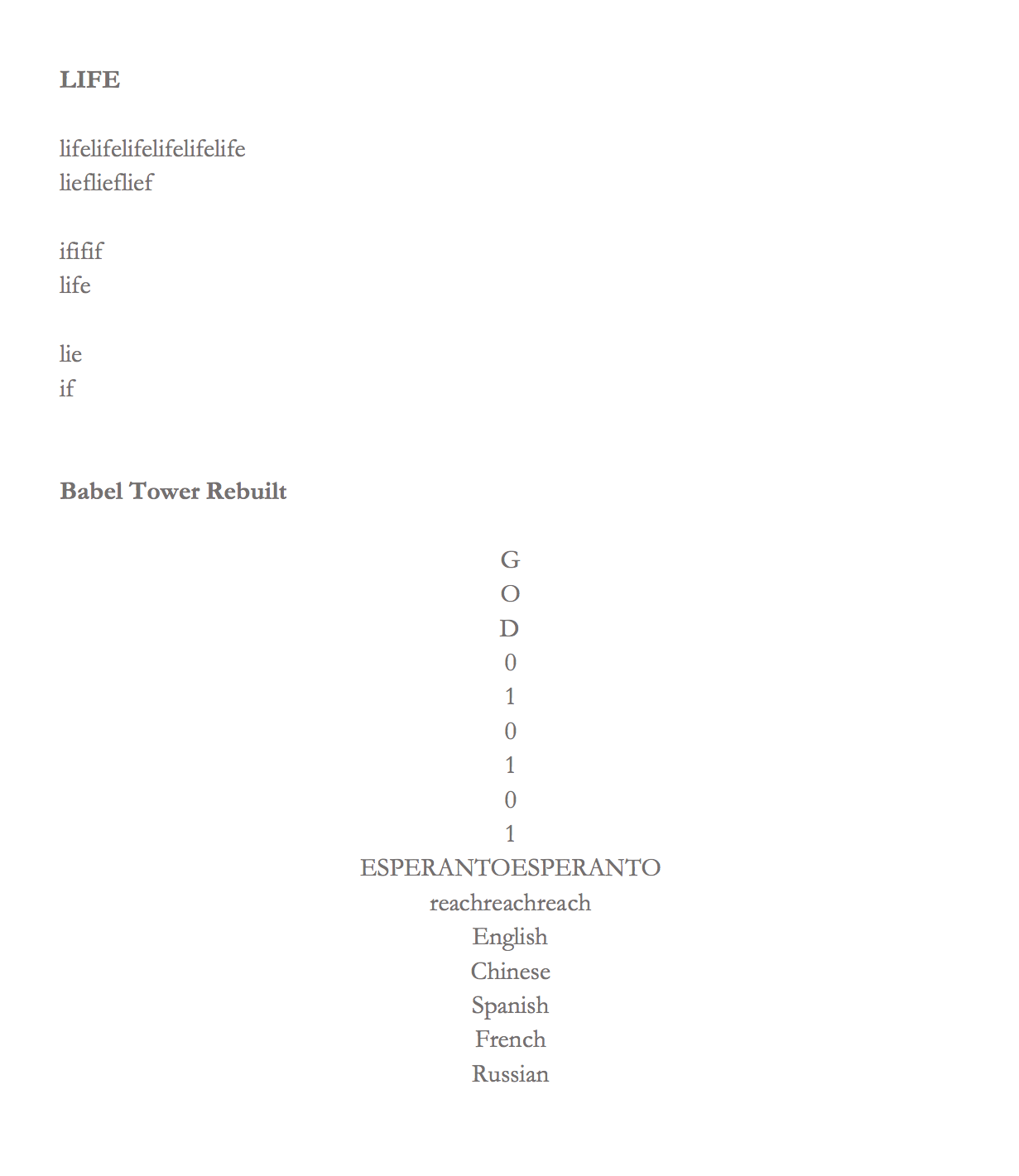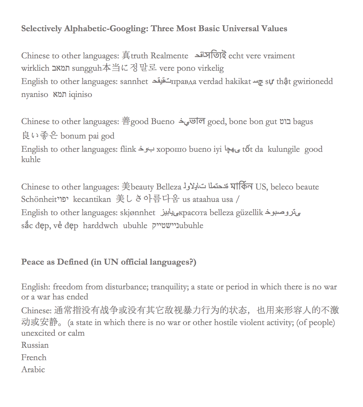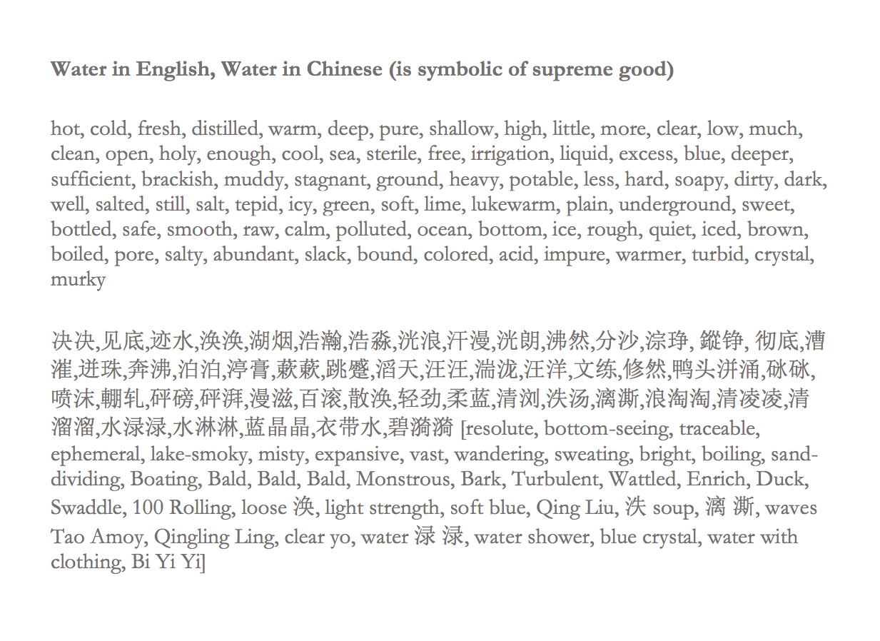 “What struck me from Changming's drafts were the three most basic universal values: truth, good and beauty. However, I also pondered on the relevance of aesthetics and goodness for people who have difficulties just making it through the day: the working class, refugees, the uneducated, the homeless. In this poem, I was interested in subversion and irony. Using Changming's draft, I selected English words originating from Greek as themes in the poem: calligraphy (kaligraphia: beautiful writing), euphony (evfonia: good sound) and cacophony (kakofonia: bad sound). Good (Kala) and good luck (kalo kuragio, literally ‘good courage’) were actual words taught to me by an ex-asylum-seeker to Greece fleeing persecution from Iran when I was an artist-in-residence in Athens researching with Babel, a daycare centre for migrants with mental health issues. I also replaced ‘th’ letters with the Greek ‘θ’ (theta) and certain ‘l’s with the ‘λ’ (lamda) for its resemblance to the Chinese character ‘人. ’”