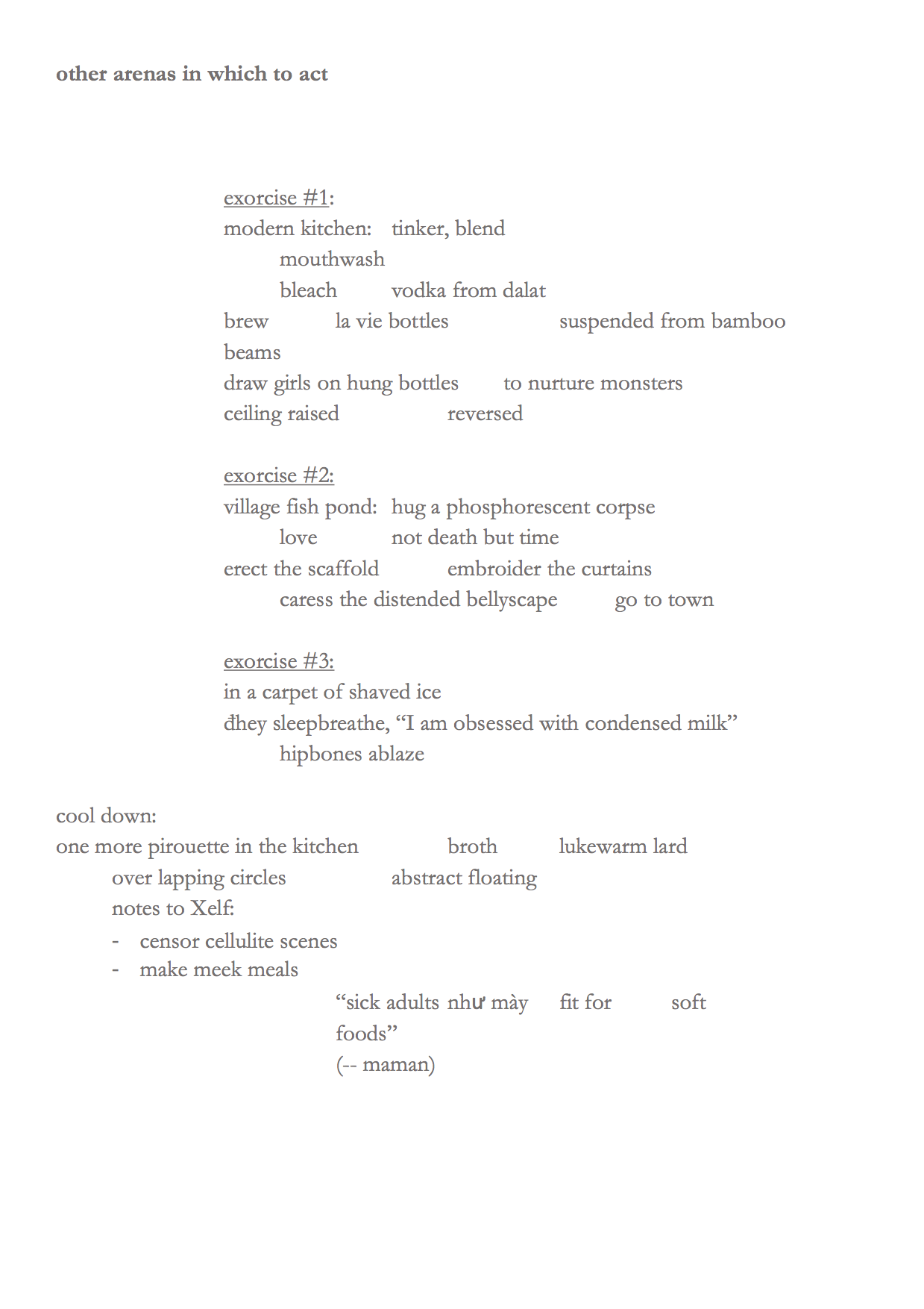 “How does one discern meaning behind text? I took Quyên Nguyễn-Hoàng’s poetic fragments, ‘other arenas in which to act,’ and fed it to my android phone. The predictive text input (SwiftKey) co-locates the poetry inside Quyên’s setting; it fills the gaps between the words that were left behind. The result is gospel, but possibly only for other poetry-writing (android) phones. The final poem, which I mined from the raw data, maintains the order of the words; the poem was edited for only grammar and length.”
