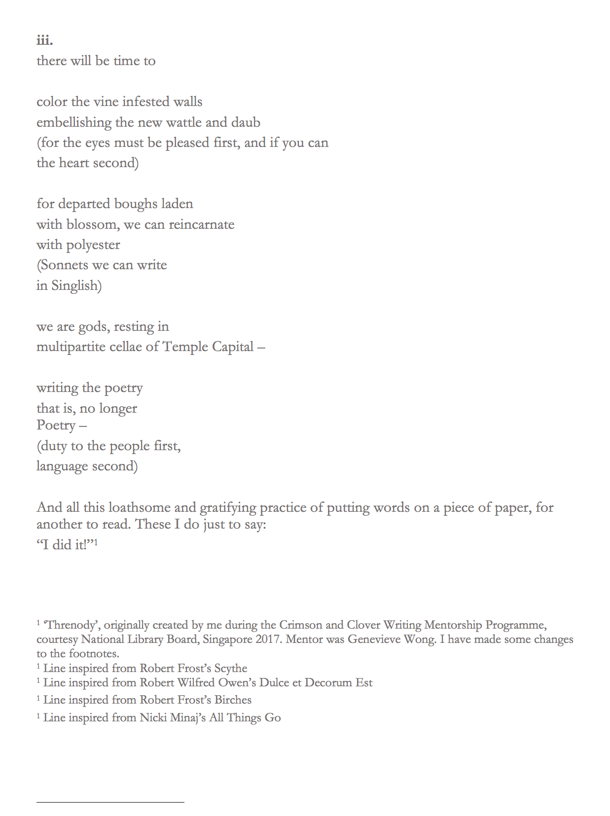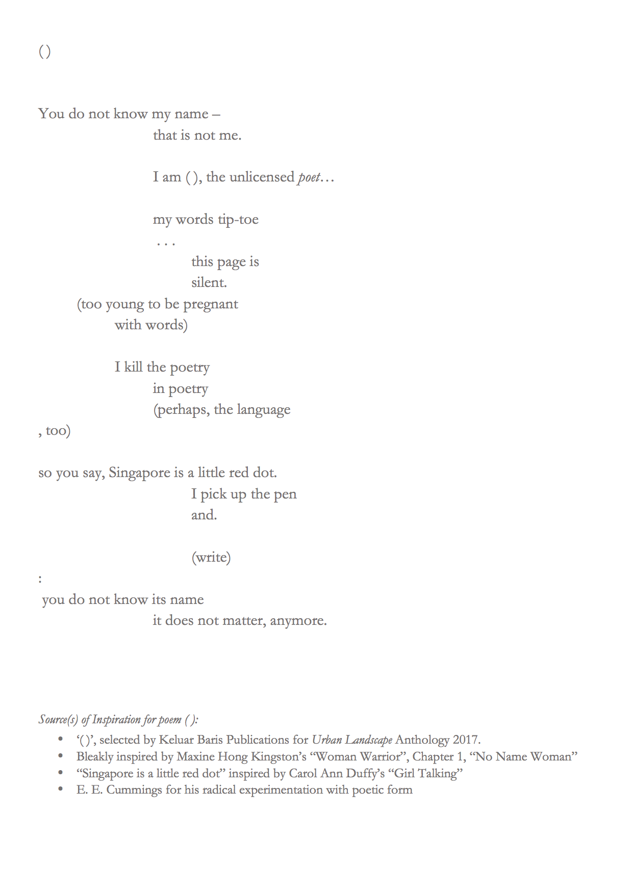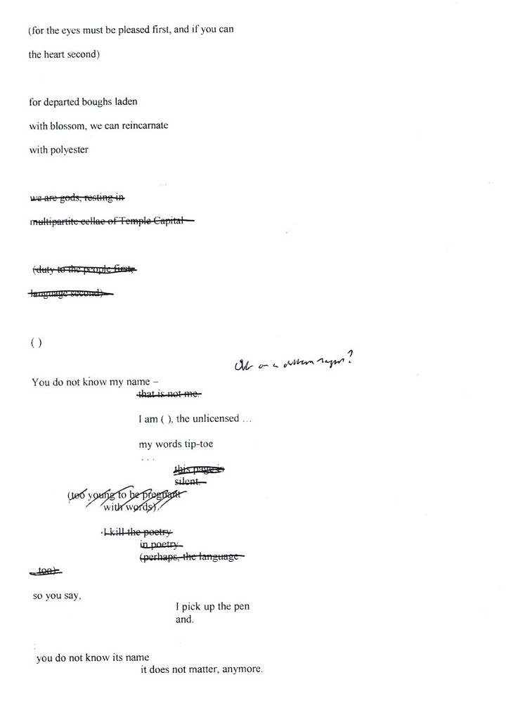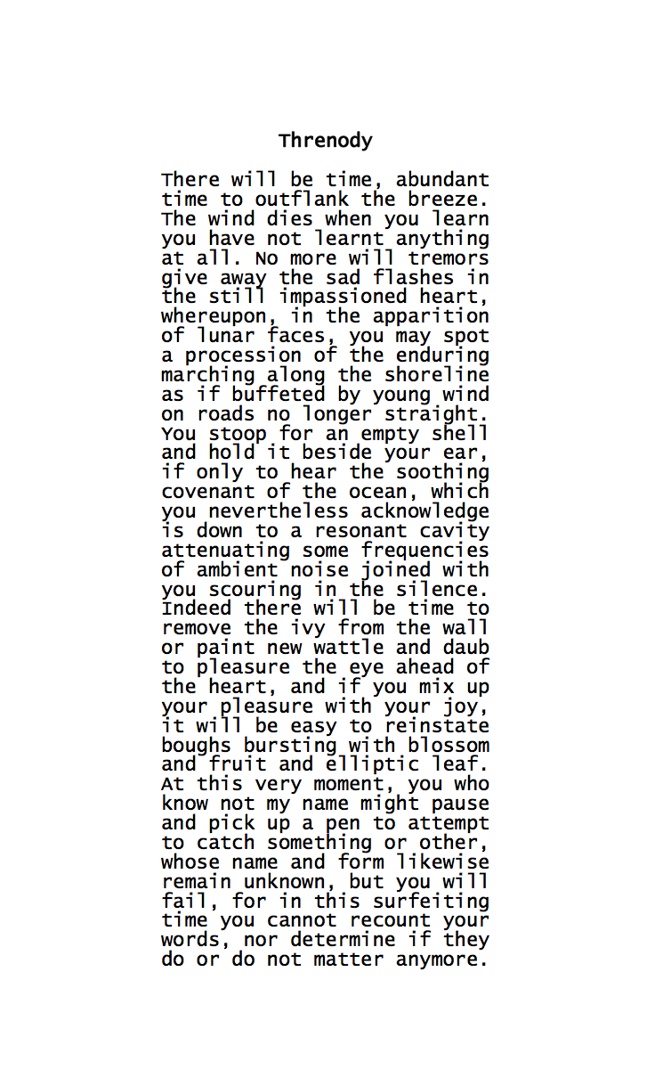 “After months of procrastination, I started on this with an editor’s mindset, taking a pen to it and striking out lines that seemed to me to be not pulling their weight, in the process cutting the poem down from its original four pages to two, and then from two to one. I then had a decision to make, which was whether to keep to my original plan of exploding the footnotes. Eventually, I elected to rewrite the one-pager, and to maintain generative momentum I of course had to have a formal constraint, which I decided should be physical lengths in monospace fonts, not least because that would enforce rework and rearrangement of the surviving lines.”